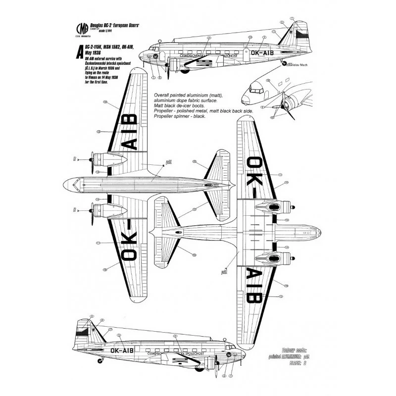 Douglas DC-2 « utilisateurs européens » avec décalcomanies. comprend plus de pièces optionnelles (deux empennages supplémentaires + hélices avec couvercles de balles, antennes, etc.) pour les versions ultérieures du DC-2, et les feuilles de décalcomanies comprennent 5 marquages – Czechoslovak Airliner CSL, Lufthansa, Swissair, KLM et Finnish Air Lines.