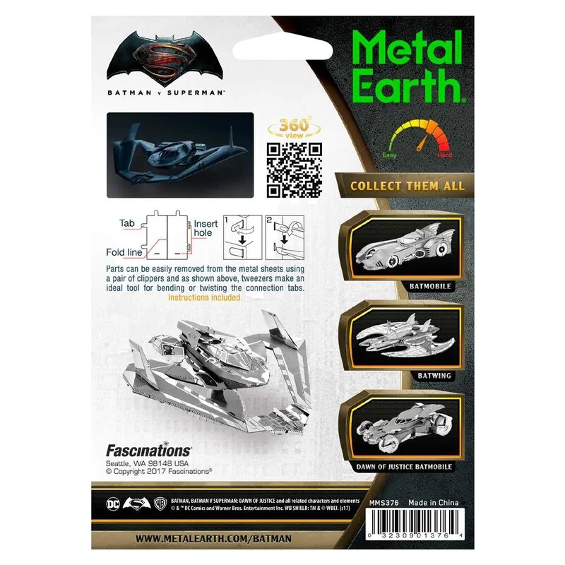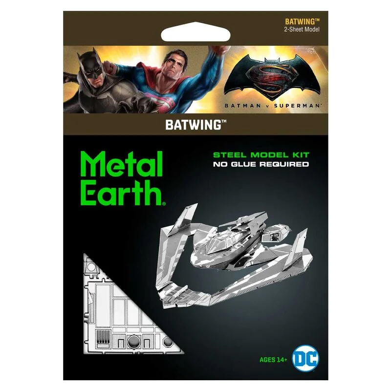 MetalEarth: BATMAN vs SUPERMAN / BATWING 9.19×9.68×4.39cm, maquette 3D en métal avec 2 feuilles, sur carte 12x17cm, 14+