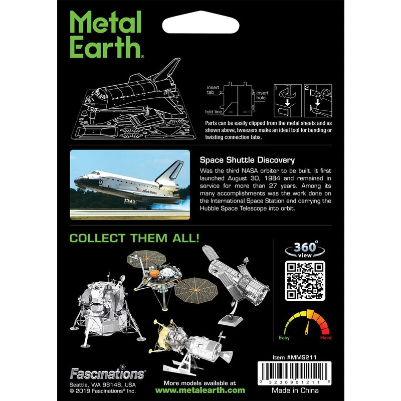 MetalEarth Espace: SPACE SHUTTLE DISCOVERY 11.43×7.11×5.84cm, maquette 3D en métal avec 2 feuilles multicolorées, sur carte 12x17cm, 14+